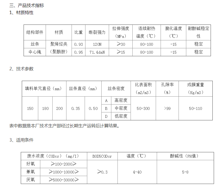 該填料篩選了聚烯烴類和聚酰胺中的幾種耐腐、耐溫、耐老化的品種,混合以親水、吸附、抗熱氧等助劑,采用拉絲,絲條制毛工藝,將絲條穿插固著在耐腐、高強(qiáng)度的中心繩上,絲條布置應(yīng)呈立體狀,絲條表面應(yīng)有微波紋,由于選材和工藝配方精良,剛?cè)徇m度,使絲條呈立體均勻排列輻射狀態(tài),制成了懸掛式立體彈性填料的單體,填料在區(qū)域內(nèi)能立體均勻舒展?jié)M布,使氣、水、生物膜得到充分混滲接觸交換,生物膜不僅能均勻地著床在每一根絲條上,保持良好的活性和空隙可變性,而且能在運(yùn)行過程中獲得愈來愈大的比表面積,又能進(jìn)行良好的代謝,這一特征與現(xiàn)象是國內(nèi)目前其他填料不可比擬的。
